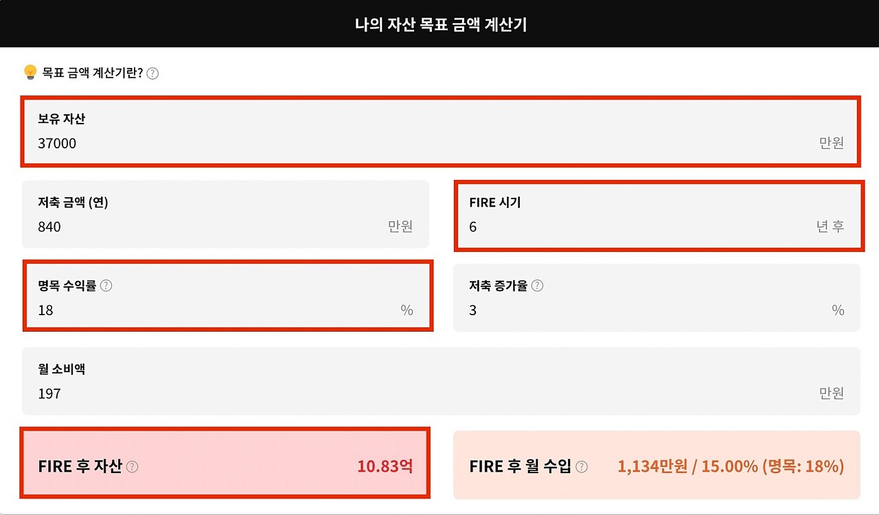 - 산출근거: 2029. 8. 보유 예상 자산(37,000만원) → 목표 명목수익률(+18%) → 6년 후 → 10.83억 달성